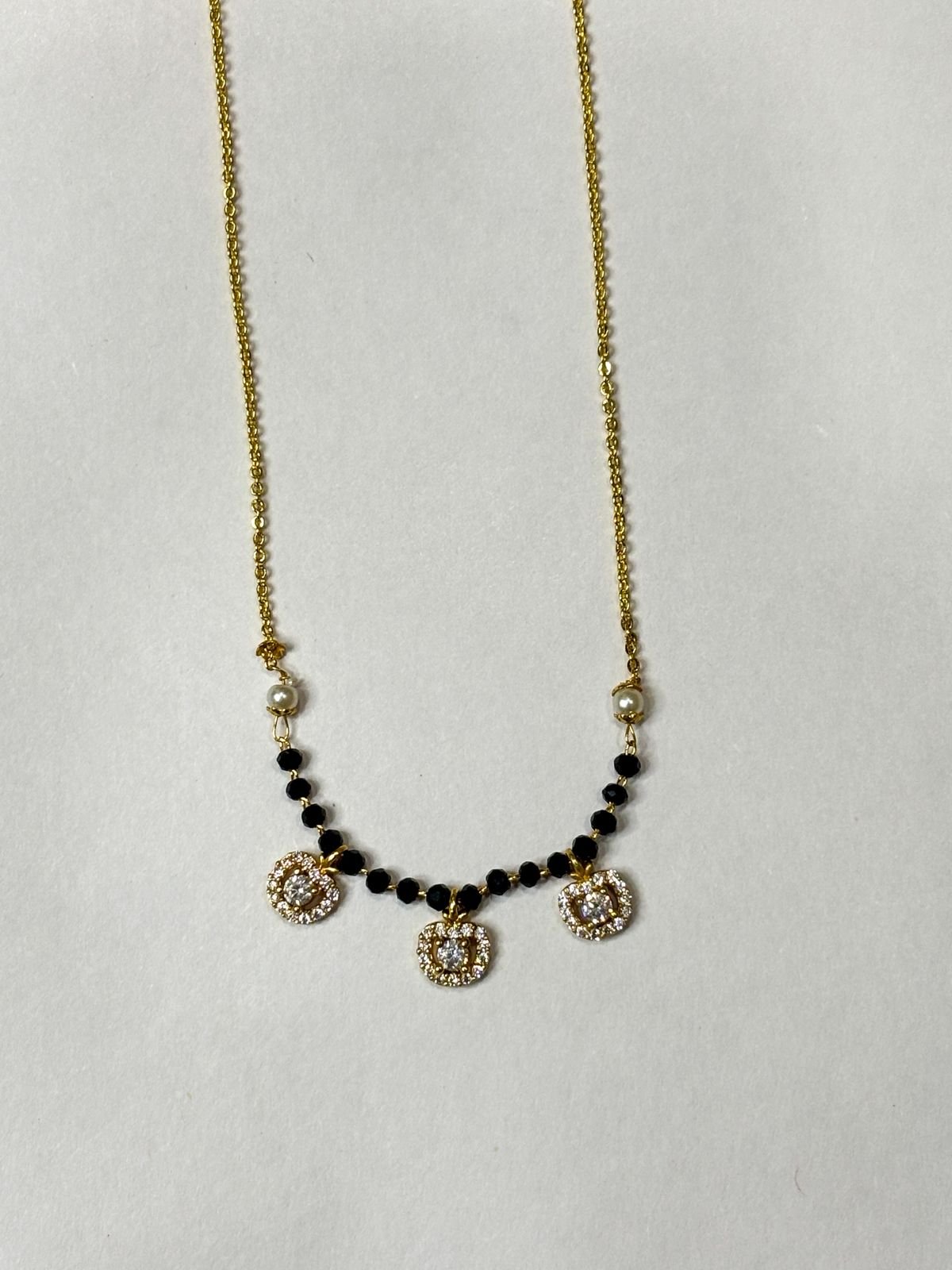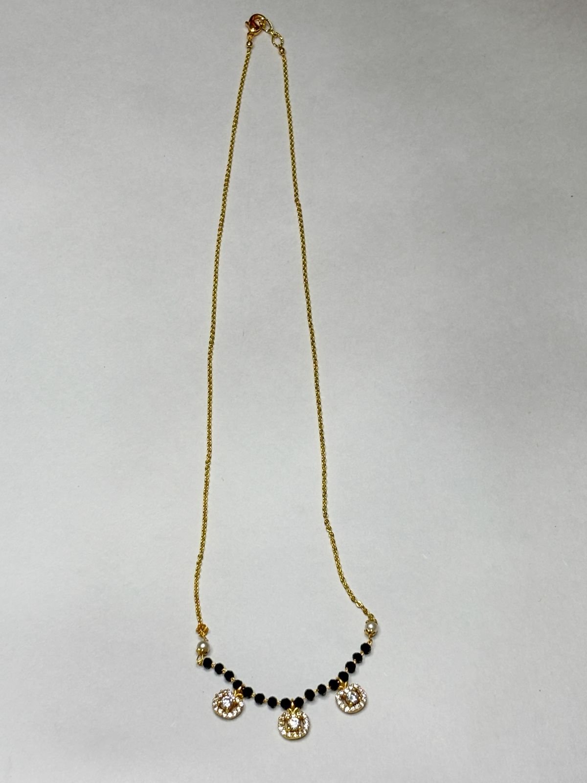 Enhance your everyday elegance with this Mangalsutra, featuring three beautifully crafted circular stone-studded charms that add a graceful shine to your look. Designed with a luxurious gold finish and traditional black bead detailing, this mangalsutra perfectly balances timeless tradition with modern sophistication.