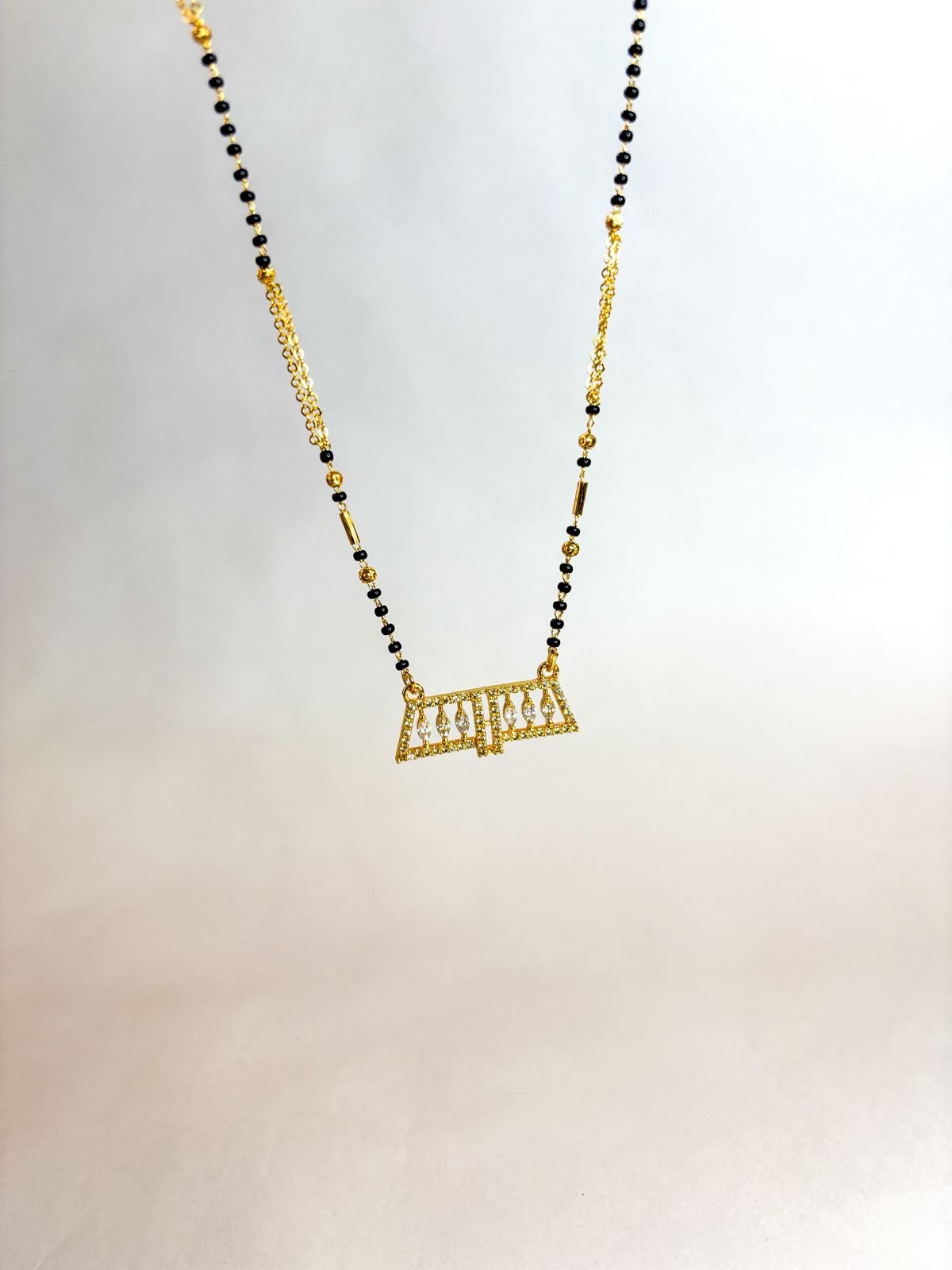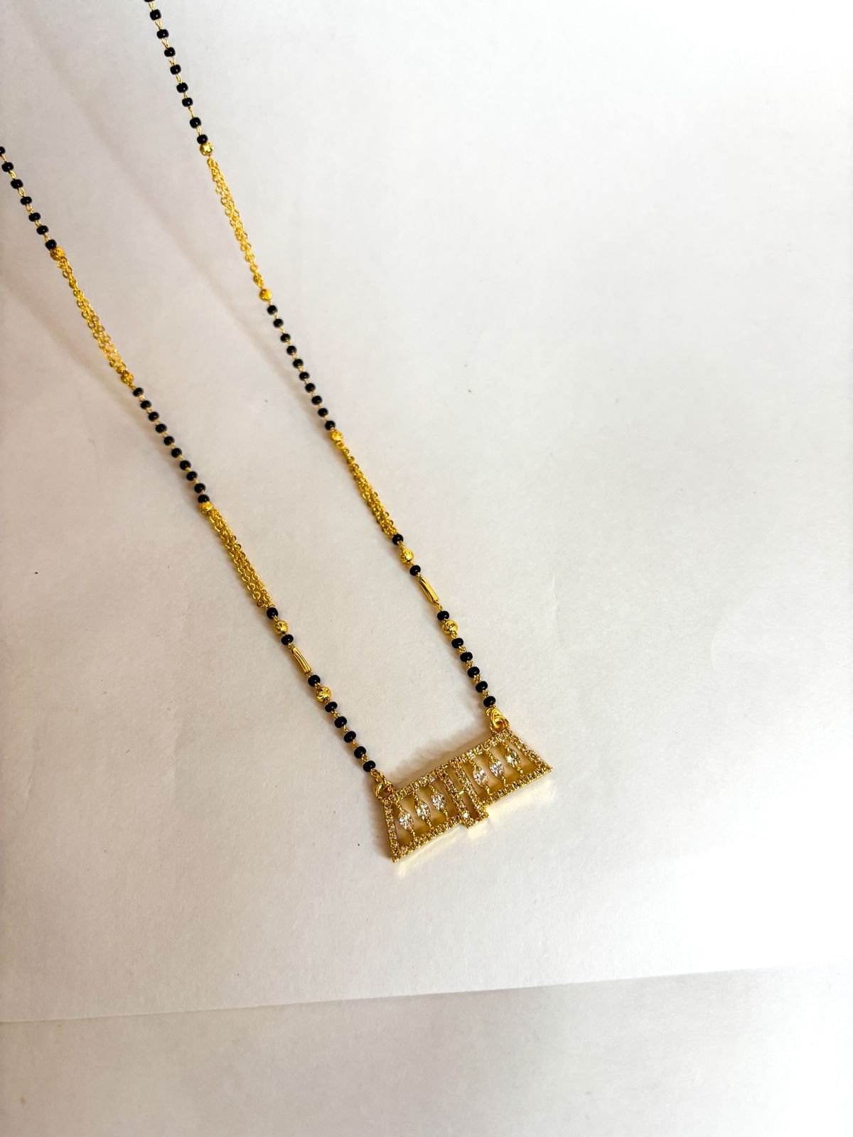 Add a touch of regal elegance to your everyday look with the Ishika Royal Bar Mangalsutra. Featuring a sleek rectangular bar pendant adorned with shimmering stone accents, this design blends modern sophistication with traditional charm. The balanced arrangement of black beads and gold-tone chain details enhances its graceful appeal, making it perfect for daily wear as well as special occasions. Lightweight, stylish, and versatile, this mangalsutra is a timeless symbol of love for the contemporary woman.