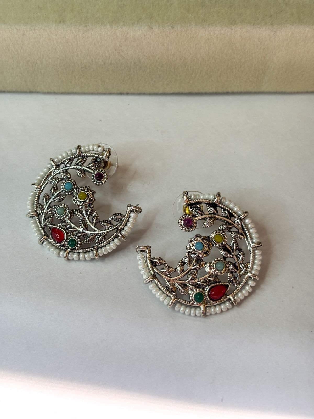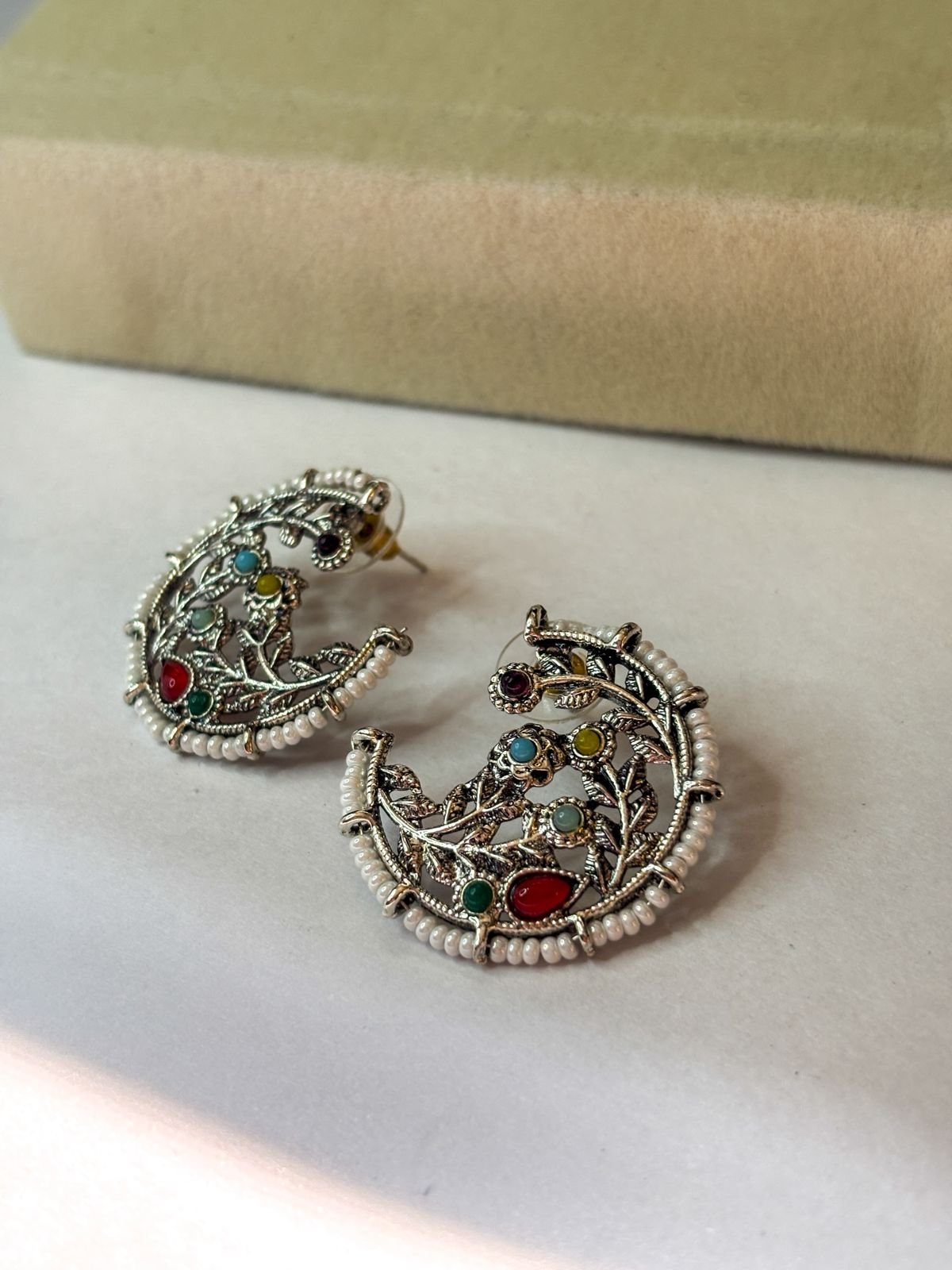 Celebrate timeless elegance with these Navratna Pearl Crescent Stud Earrings. Beautifully crafted in an oxidized silver finish, these earrings feature an intricate crescent design adorned with colorful Navratna stones and delicate pearl beading along the border. The detailed vine-inspired pattern adds a royal and artistic touch, making them perfect for festive occasions, weddings, traditional functions, and ethnic wear. Lightweight yet eye-catching, these earrings offer a graceful blend of heritage charm and contemporary style.