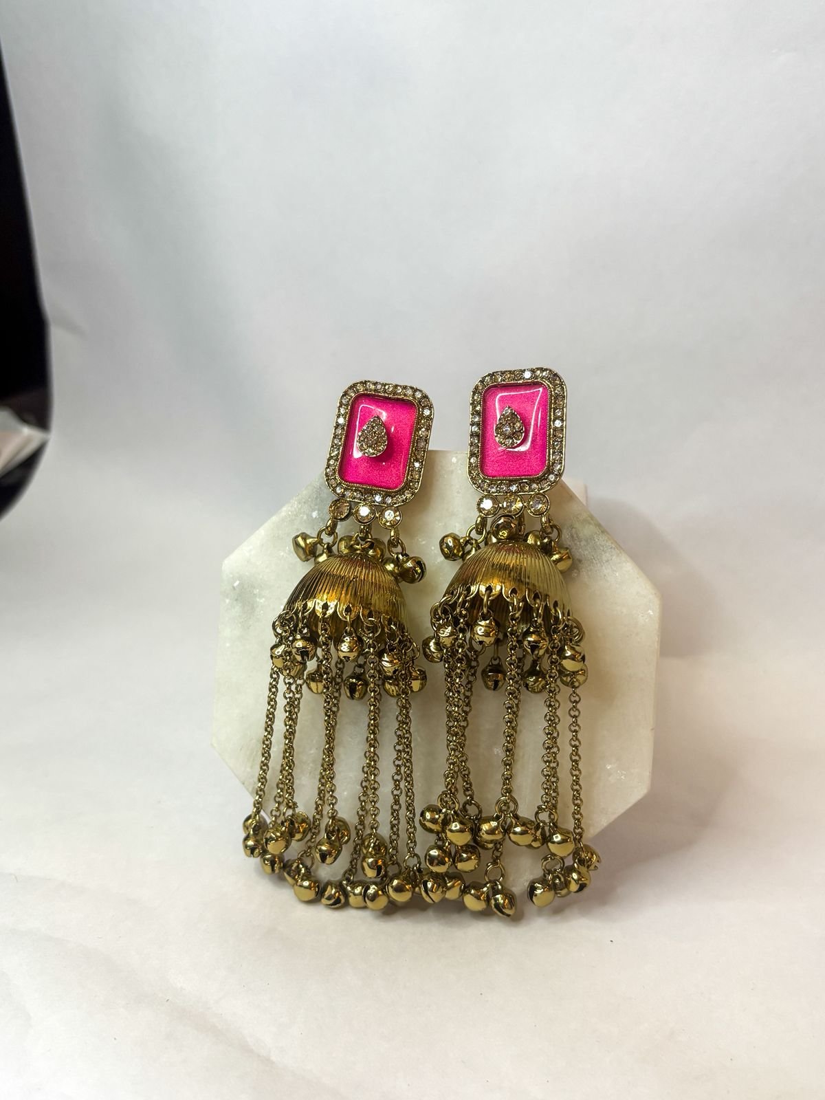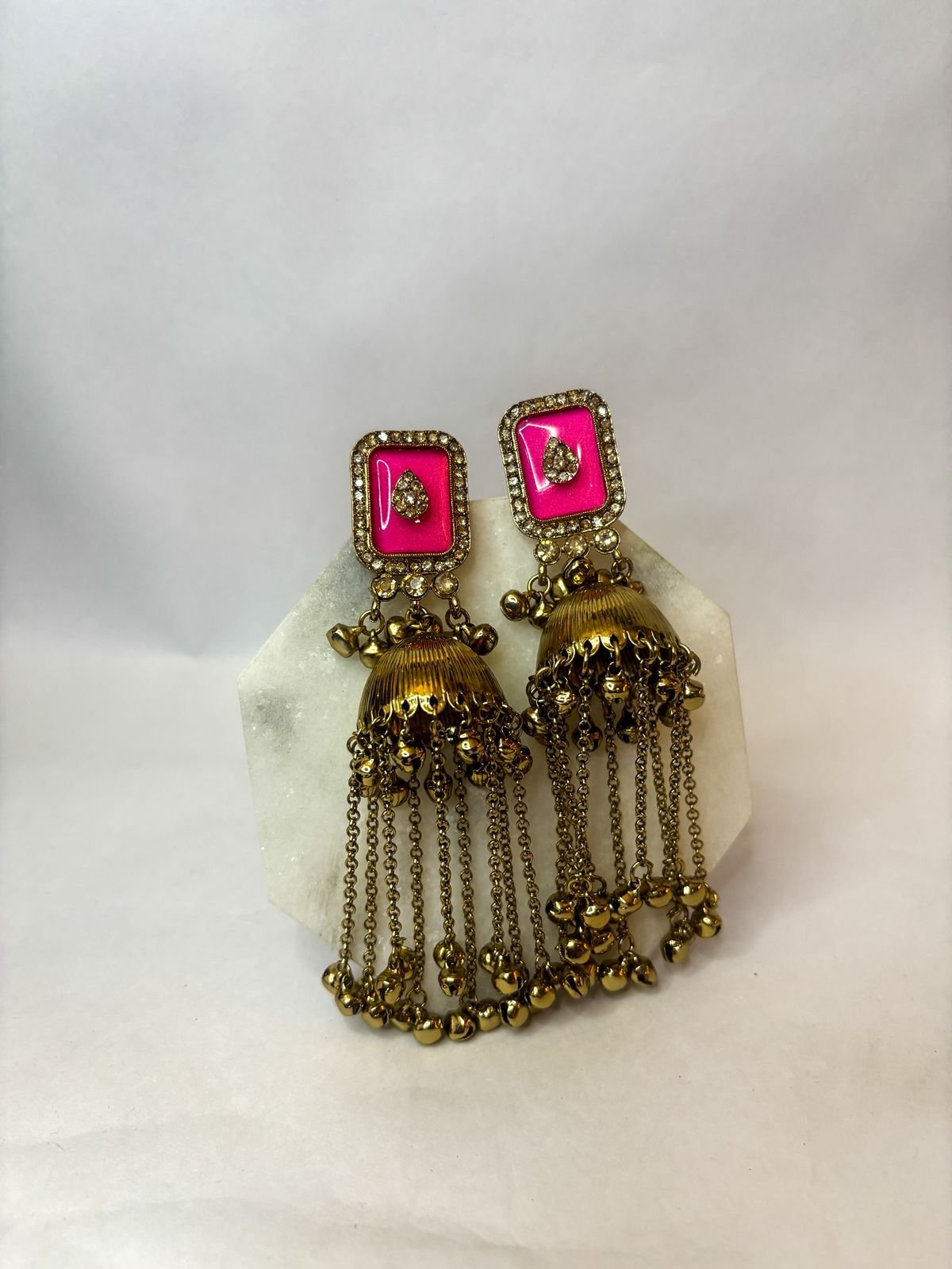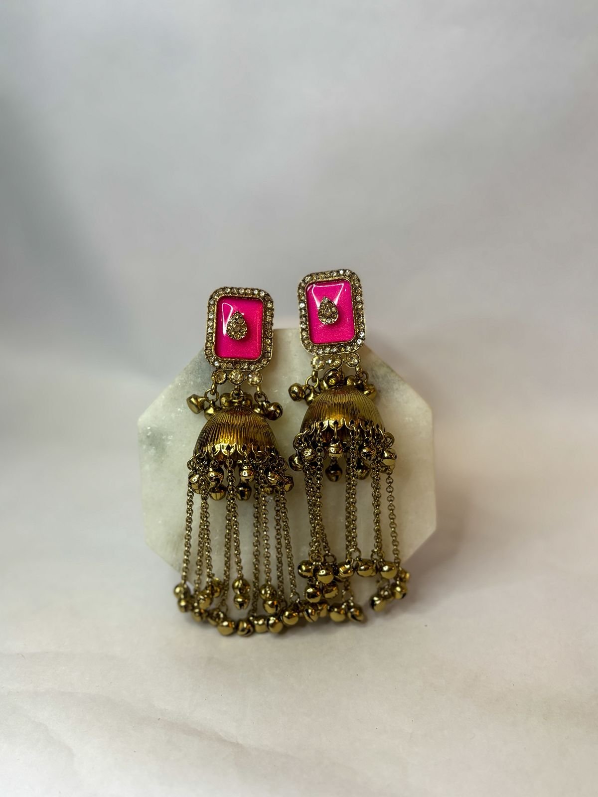 Bring a royal festive vibe to your look with our Noor Pink Kashmiri Tassel Jhumka Earrings by RosyBling. Featuring a vibrant  rani pink enamel top adorned with sparkling stones, these earrings beautifully blend traditional Kashmiri artistry with a bold modern touch.