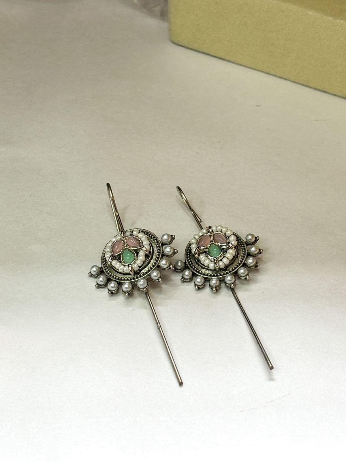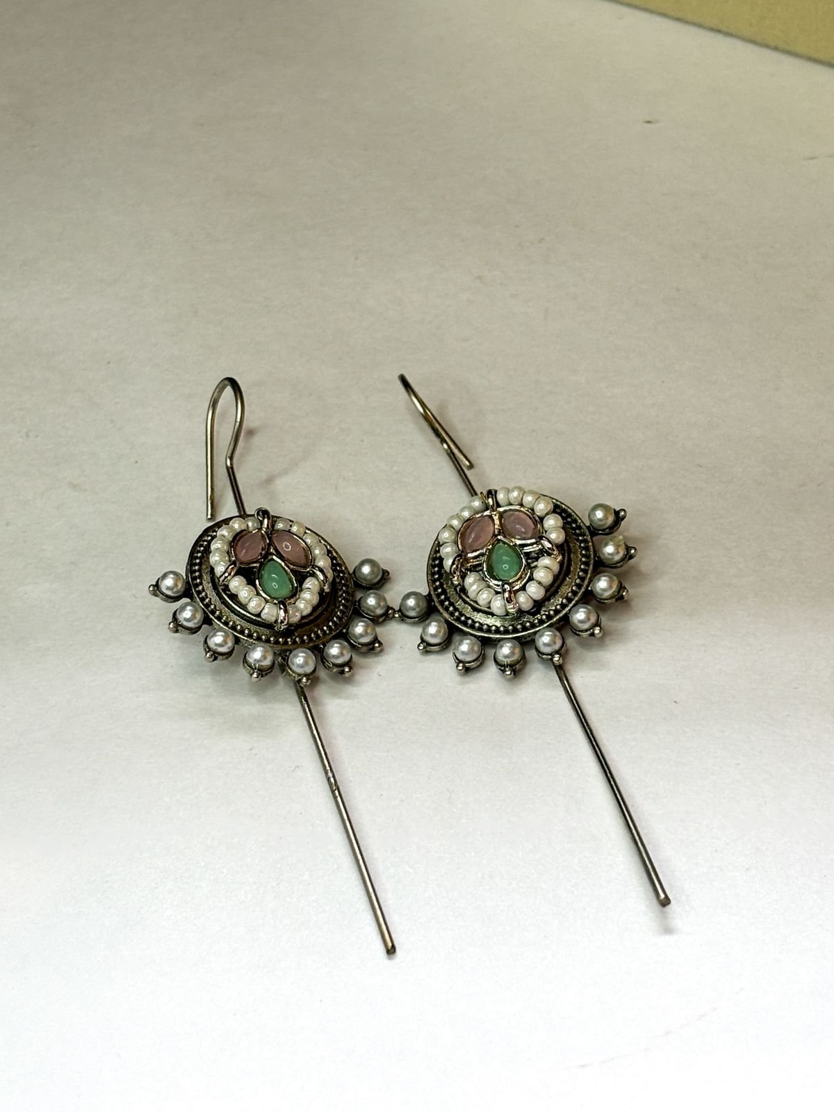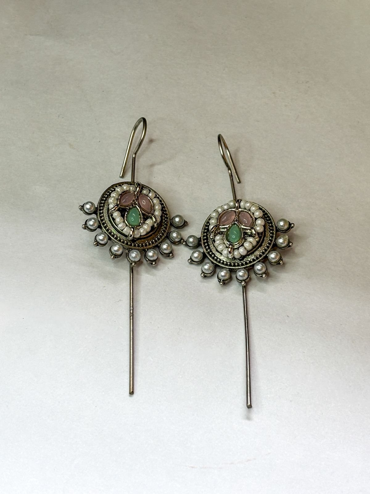 Add timeless elegance to your jewelry collection with these Pastel Pearl Mandala Drop Earrings. Designed with a beautifully detailed oxidized silver circular base, highlighted with soft pastel stones and surrounded by delicate pearl accents, these earrings create a perfect balance of tradition and modern charm. The long drop stick design adds a graceful silhouette, making them ideal for festive wear, weddings, ethnic outfits, and fusion styling. Lightweight and eye-catching, these earrings bring effortless sophistication to every look.