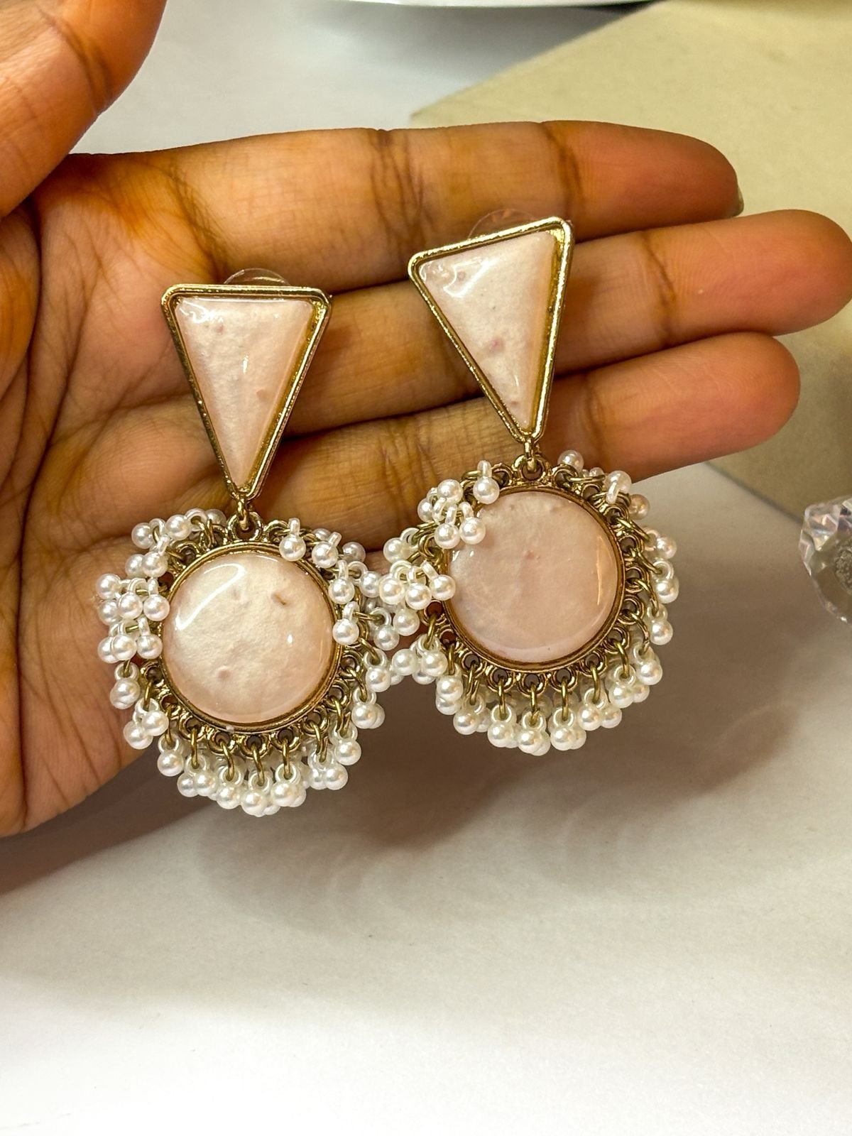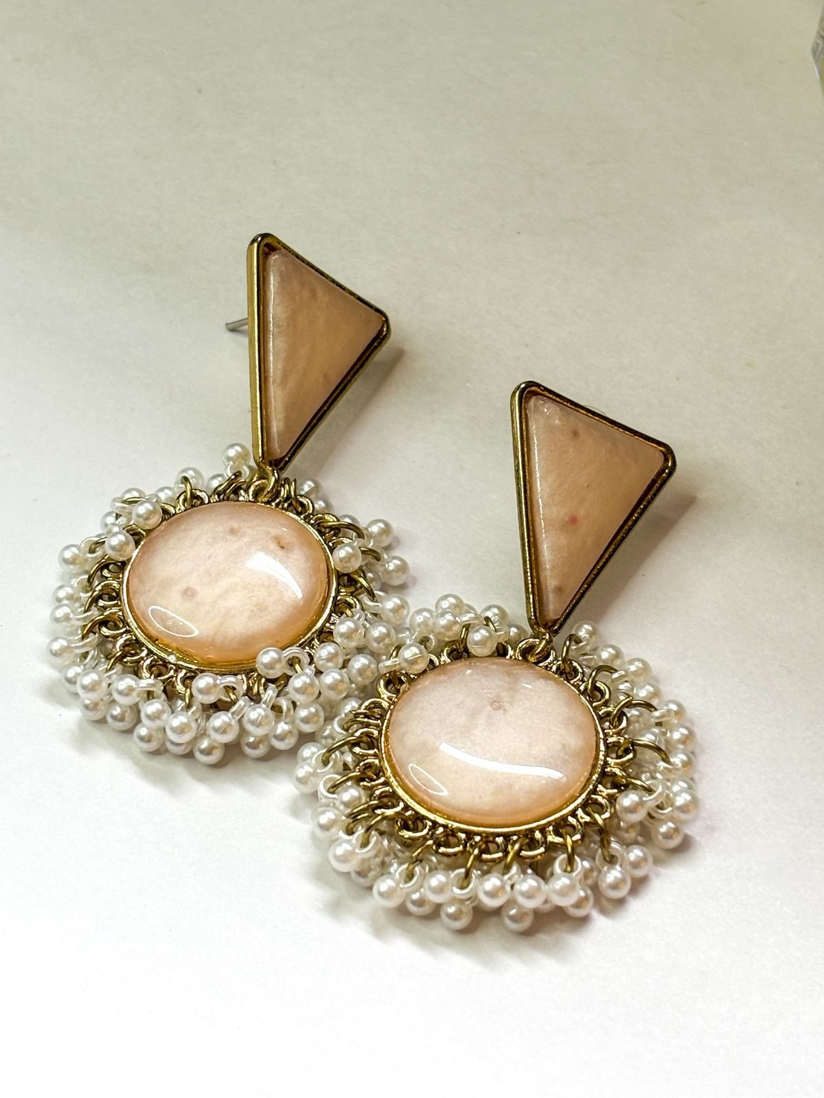 Make a graceful style statement with these Peach Royale Pearl Drop Earrings, featuring a chic triangular peach stone top paired with a glossy round peach centerpiece surrounded by delicate pearl fringe detailing. Finished in a rich gold-tone frame, these earrings beautifully blend modern geometry with traditional elegance.