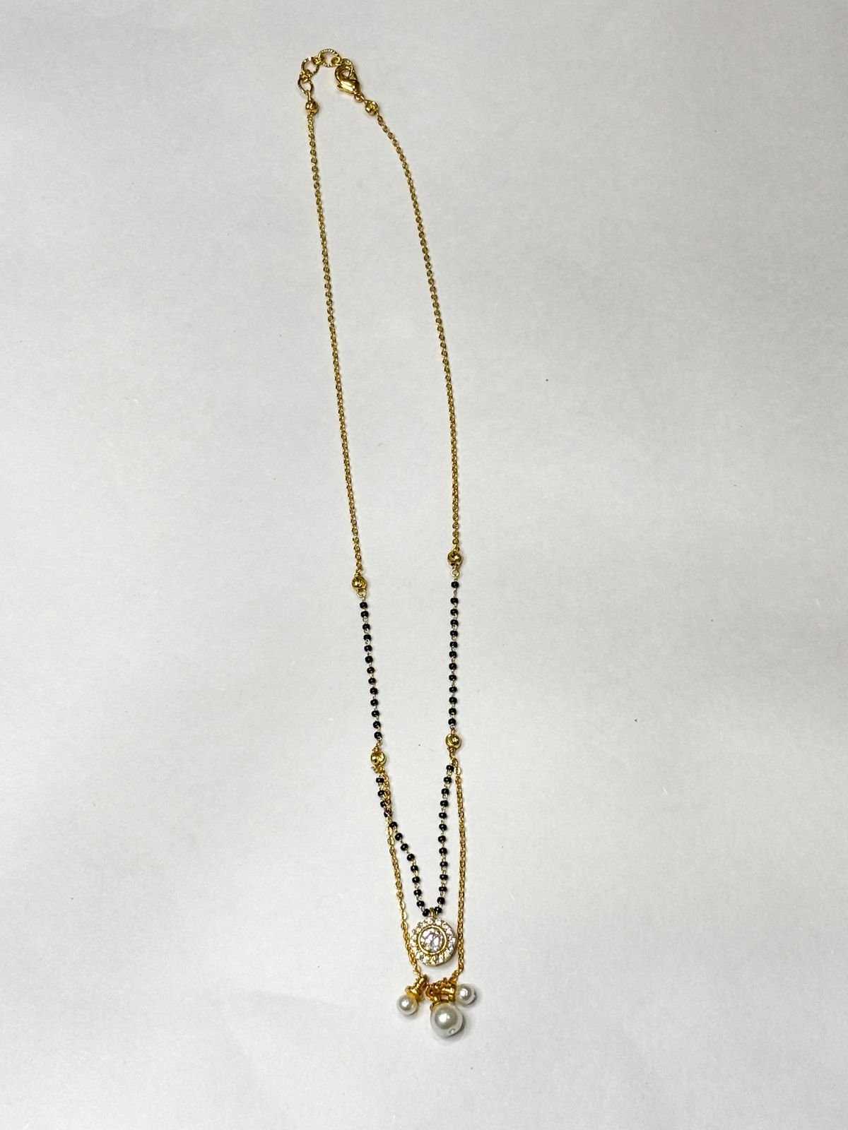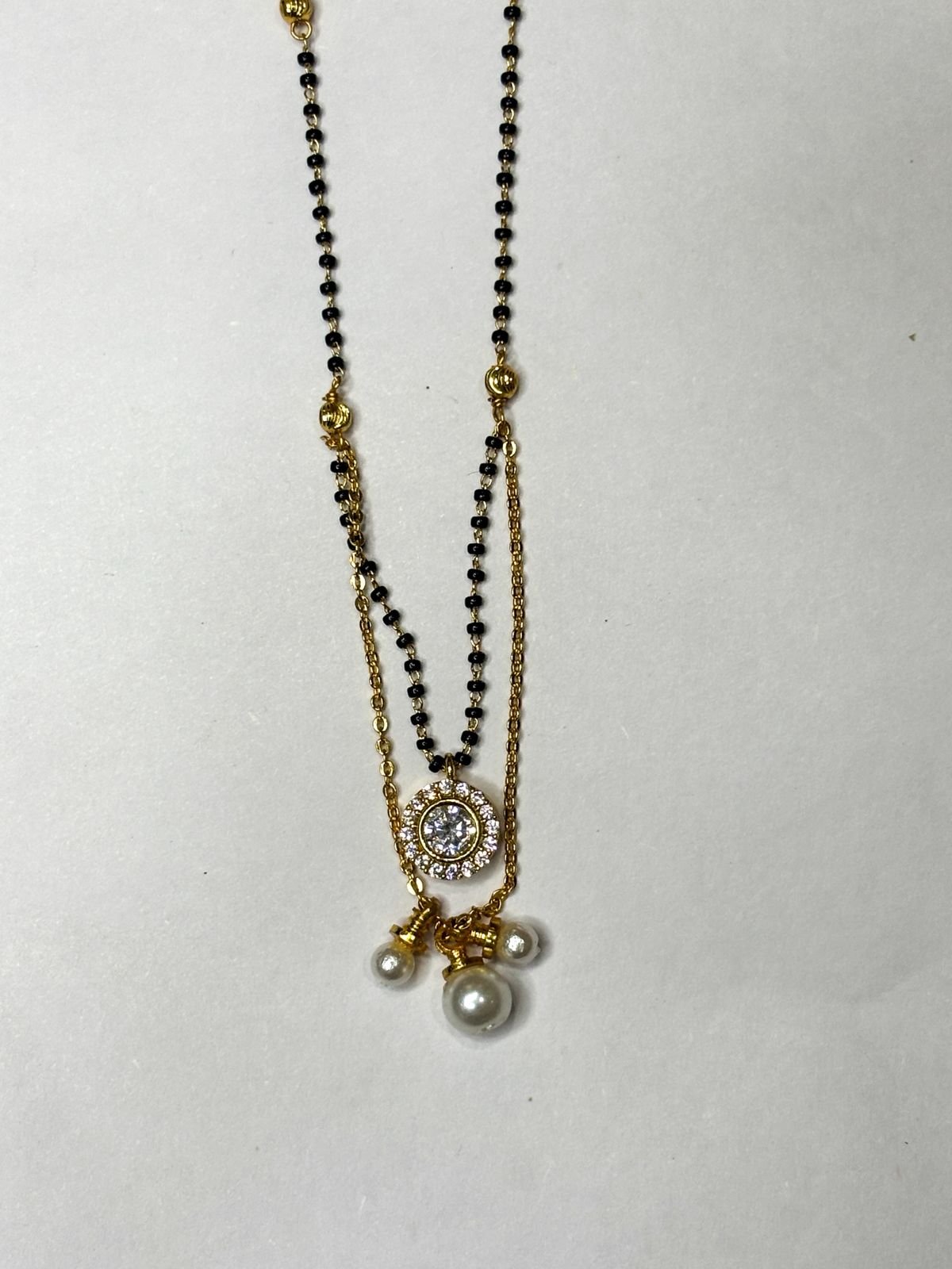 Add timeless grace to your jewelry collection with this Pearl Halo Drop Mangalsutra, featuring a sparkling circular stone pendant paired with elegant pearl drop charms. Designed with a luxurious gold finish and traditional black bead detailing, this mangalsutra beautifully blends heritage elegance with modern minimalism.