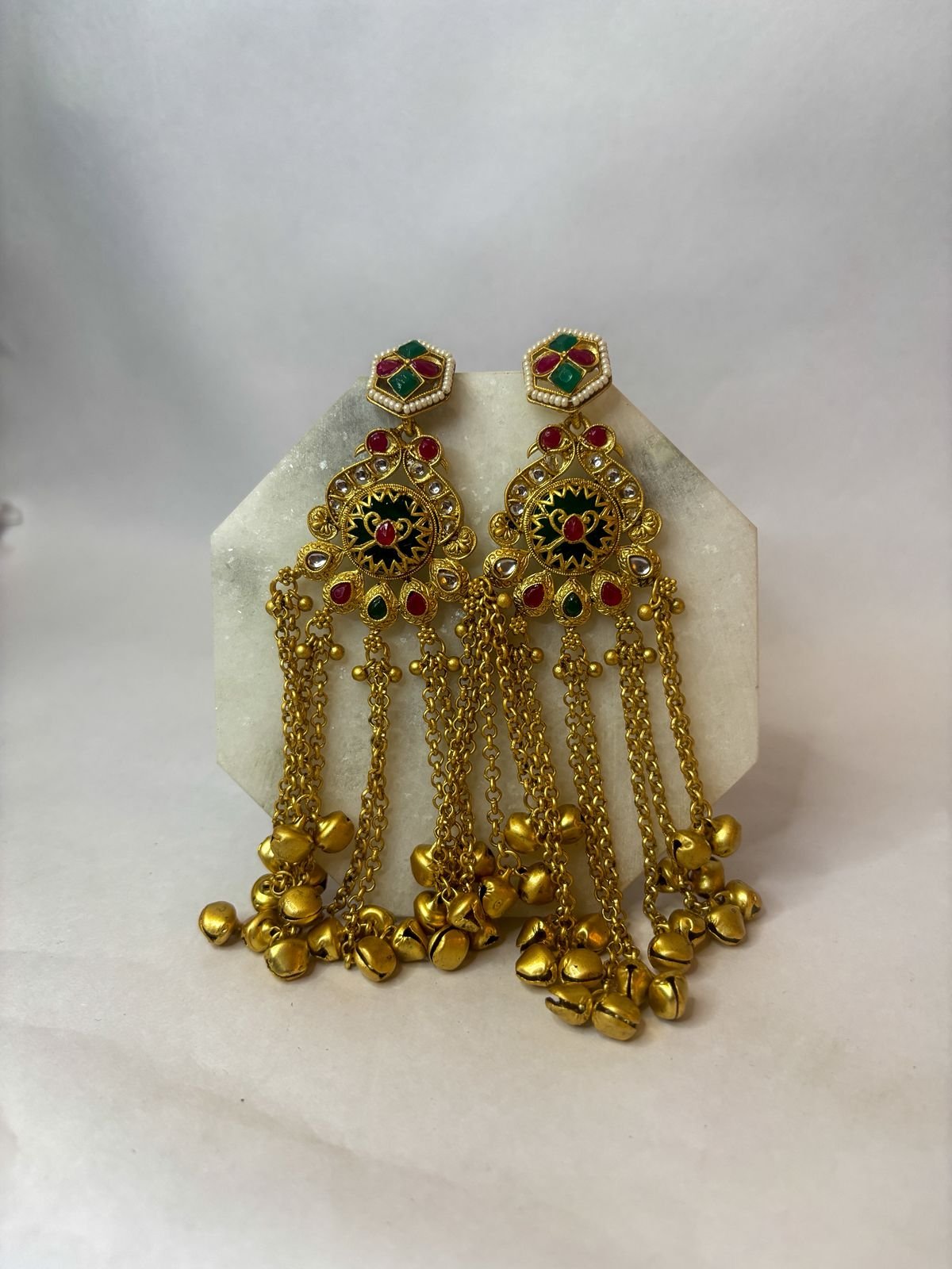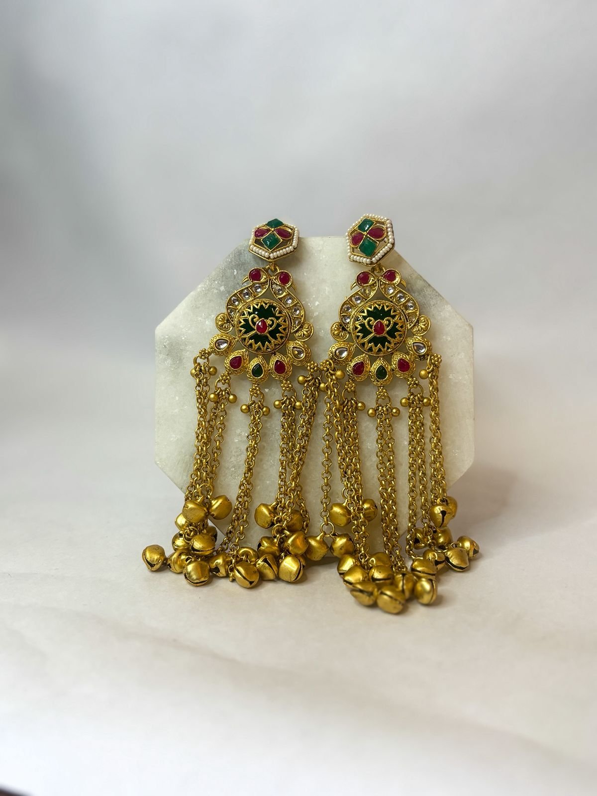 Embrace royal tradition with our Rangrez Kashmiri Ghungroo Earrings by RosyBling. Featuring intricate antique gold craftsmanship with vibrant red and green stone accents, these earrings beautifully reflect the richness of Kashmiri heritage jewelry.