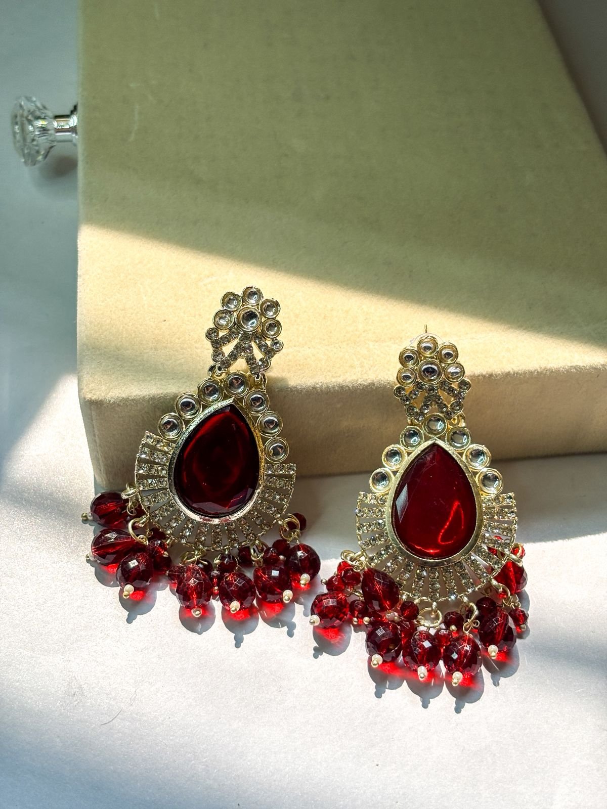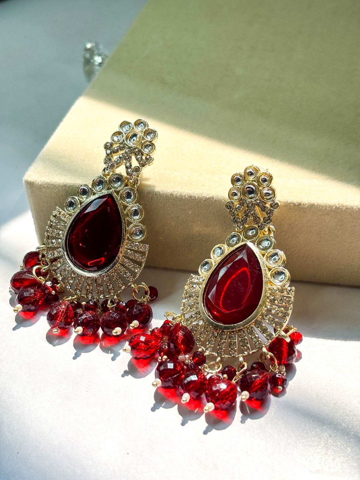Make a bold royal statement with our Earrings. Designed with a dazzling deep-red teardrop stone, sparkling kundan-style detailing, and rich red crystal bead hangings, these earrings reflect luxury and elegance in every movement. Perfect for weddings, cocktail parties, and festive occasions, they add instant glamour to both ethnic and fusion outfits.