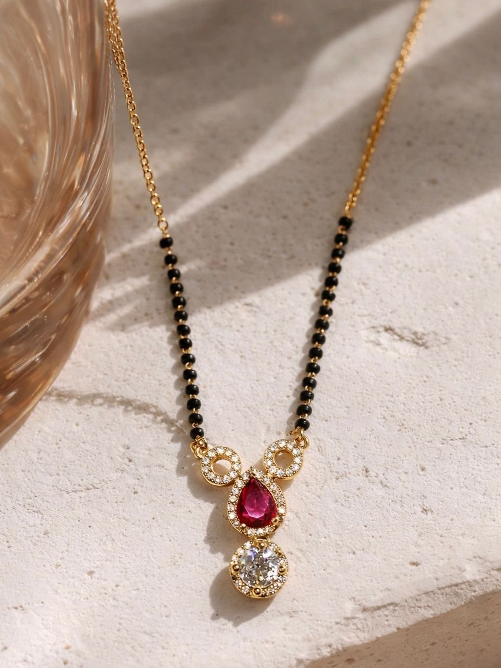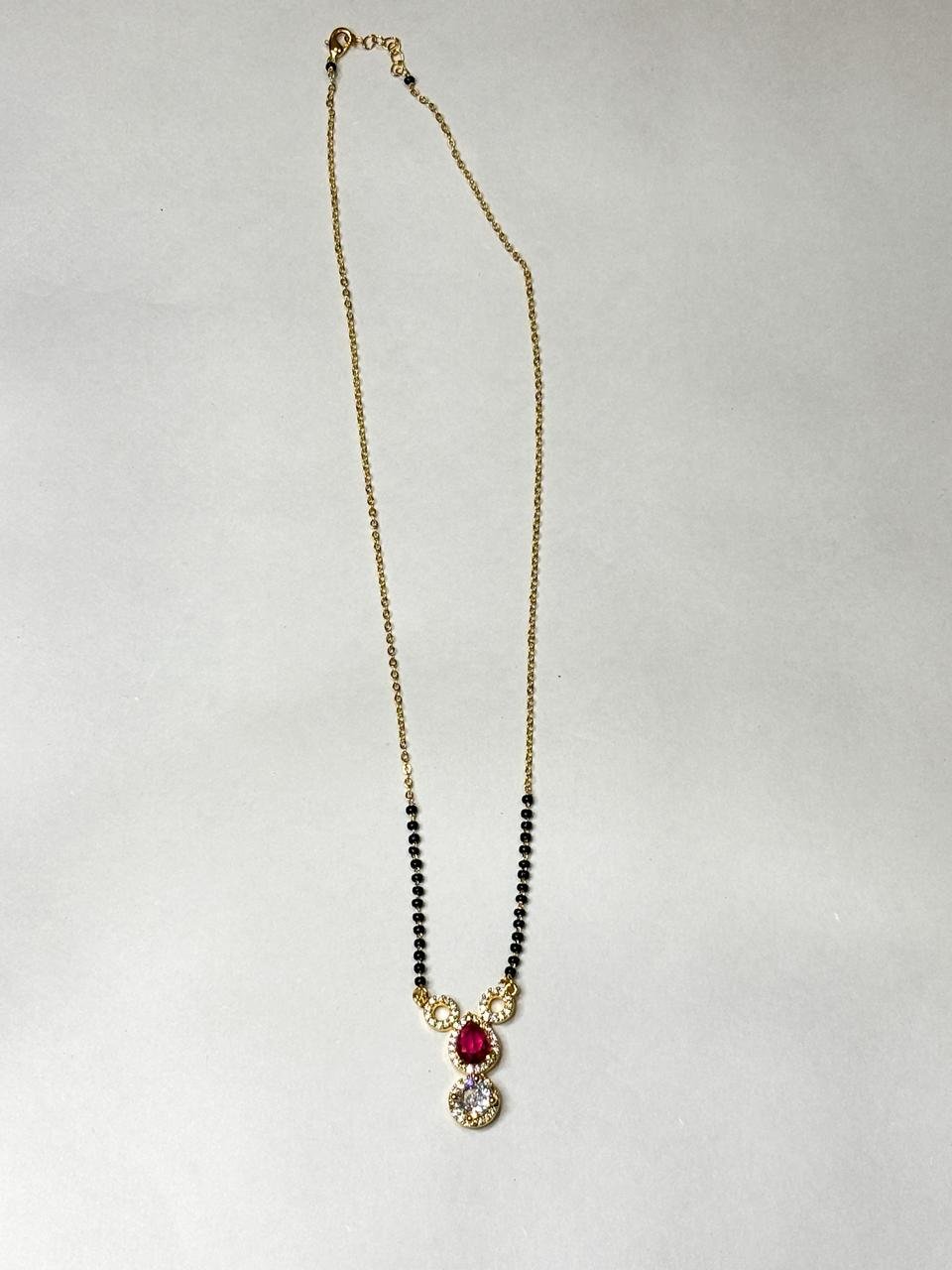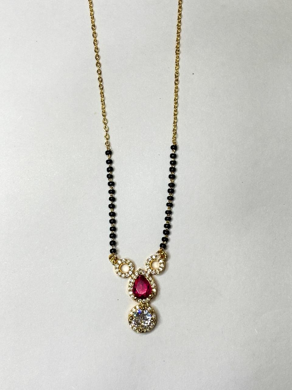 Make a bold and elegant statement with this Ruby Drop Royal Mangalsutra, featuring a stunning ruby-colored teardrop stone paired with a sparkling crystal charm and delicate halo detailing. Designed with a premium gold finish and traditional black bead chain, this mangalsutra reflects royal elegance and timeless beauty.