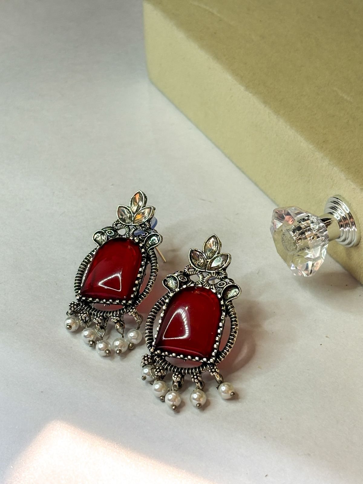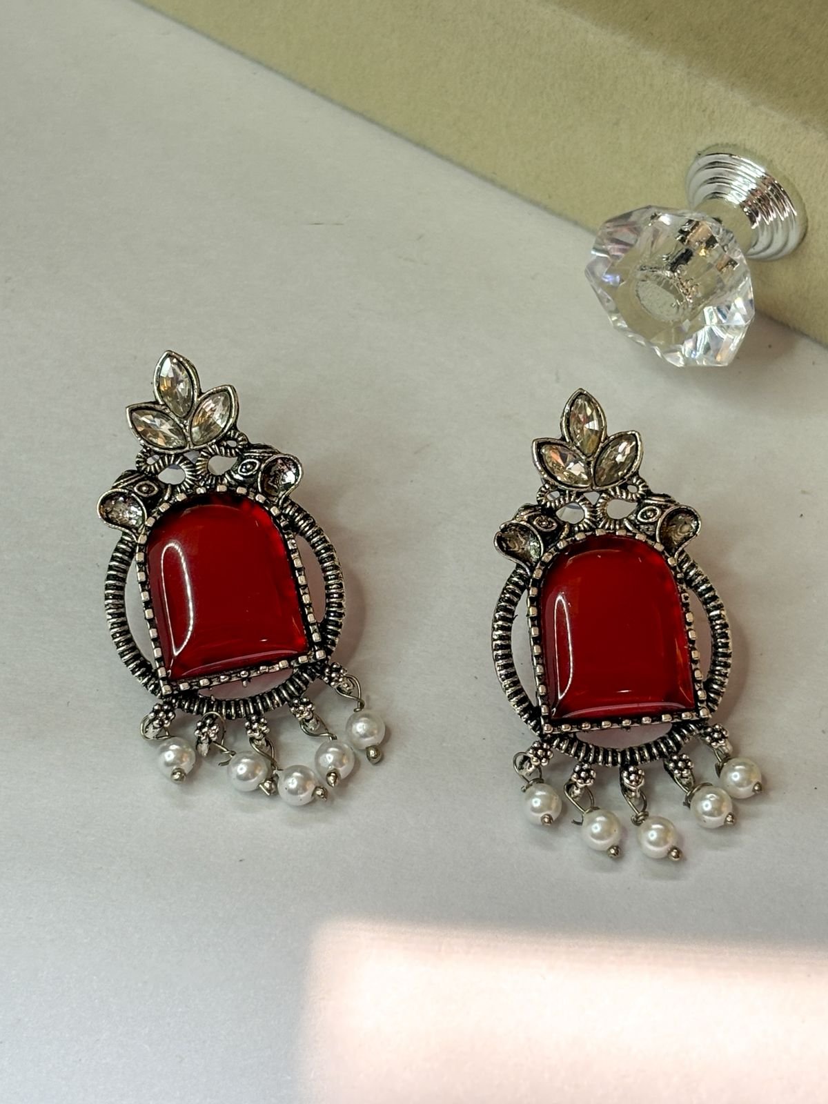 Add royal elegance to your look with our Ruby Noor Pearl Drop Earrings. Featuring a rich deep-red stone framed in antique silver finish and highlighted with delicate pearl hangings, these earrings bring a perfect blend of traditional charm and modern grace. Ideal for weddings, festive occasions, and ethnic outfits, they instantly elevate your style with a bold yet classy appeal.