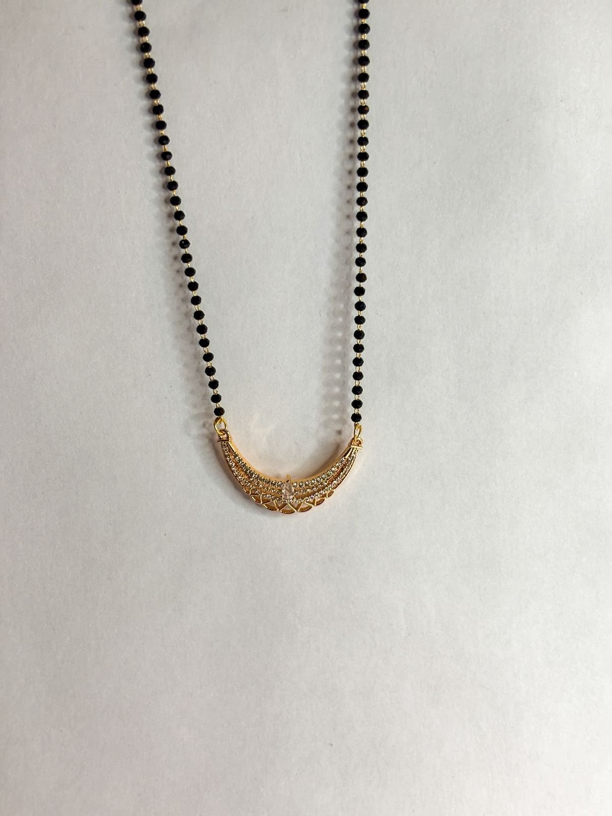 Elegant and contemporary, the Ruhani Lattice Curve Mangalsutra is crafted to add a graceful sparkle to your everyday look. The beautifully curved pendant features shimmering stone-studded lines paired with a delicate lattice design, creating a perfect balance of modern style and traditional charm. The classic black beaded chain enhances its authentic mangalsutra appeal, making it ideal for daily wear as well as special occasions. Lightweight and versatile, this piece is a timeless symbol of love for the modern woman.