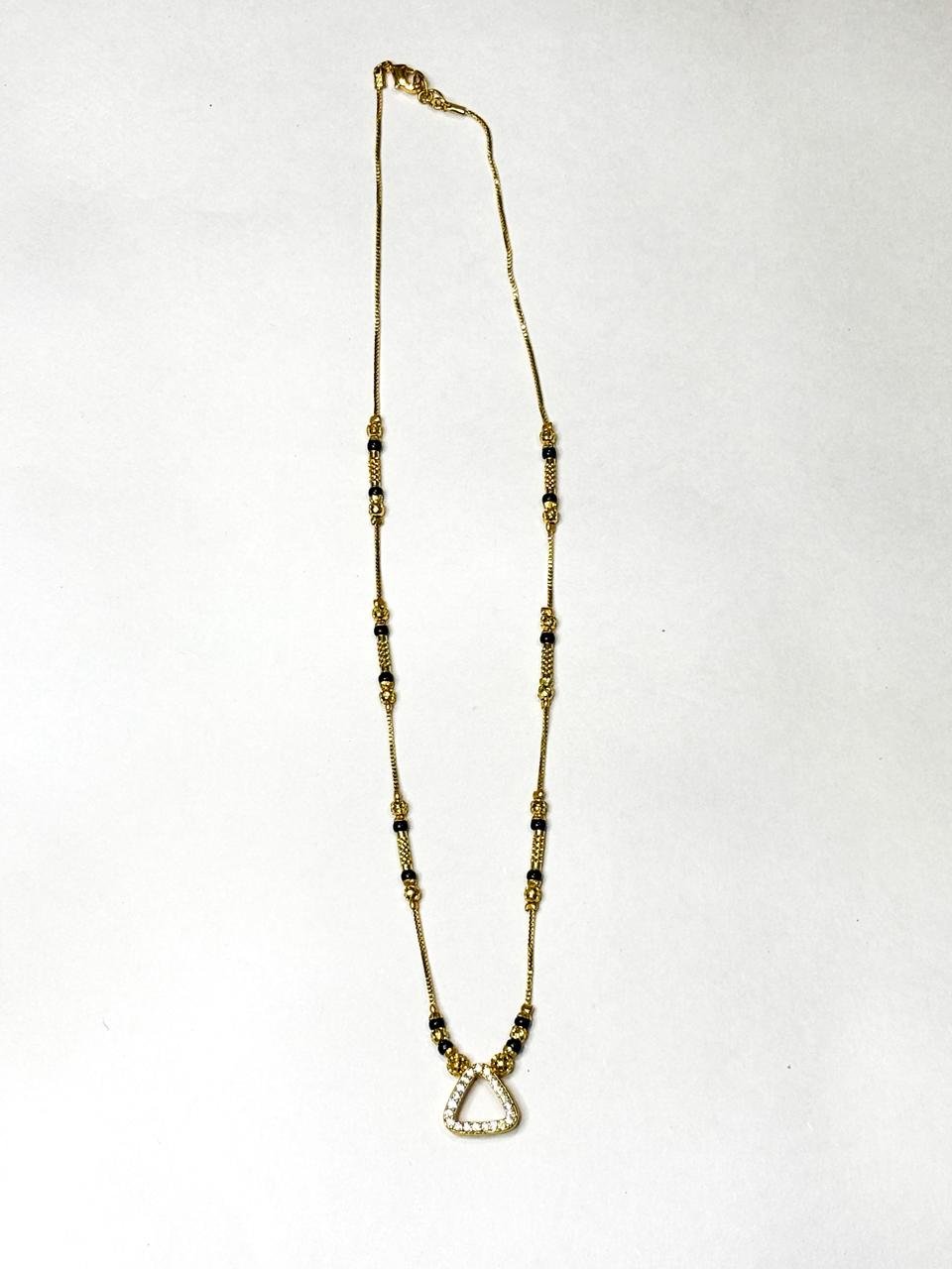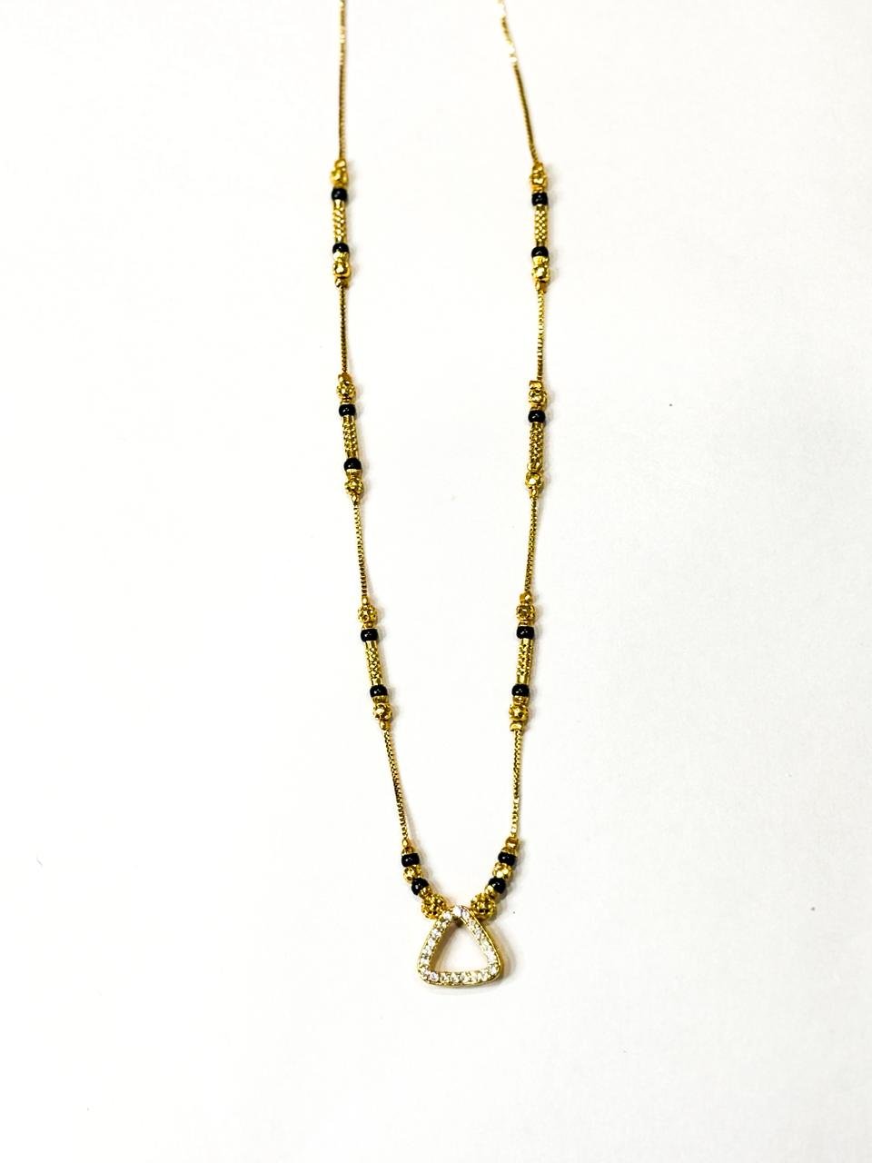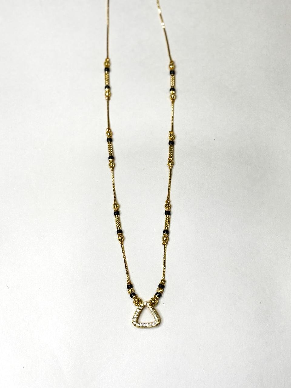 Upgrade your everyday style with this Triangle Spark Charm Mangalsutra, featuring a sleek triangle-shaped crystal-studded pendant that represents strength, balance, and harmony. Designed with a premium gold finish and classic black bead chain detailing, this mangalsutra offers a perfect blend of contemporary fashion and traditional beauty.